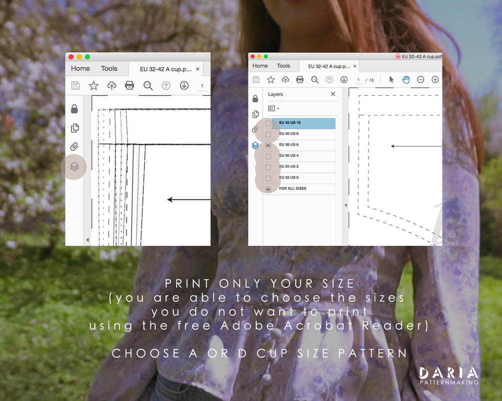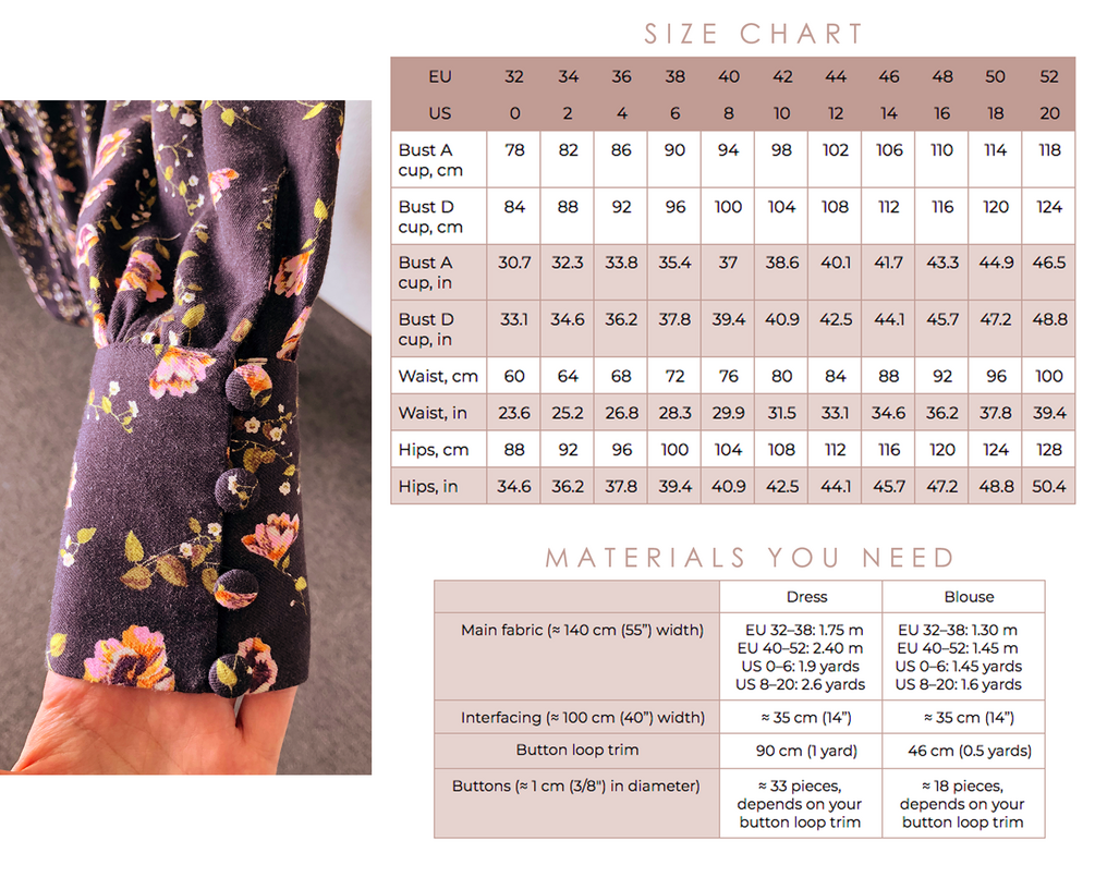 Million Buttons Dress pattern includes 5 PDF files: 2 patterns in sizes EU 32-42 US 0-10 for A and D cup, 2 pattern in sizes EU 44-52 US 12-20 for A and D cup, and instructions. The pattern is designed for A4 pages. It also works on Letter format pages, just the borders will be slightly wider.