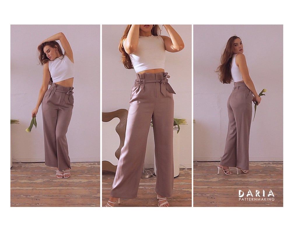 This is a digital PDF sewing pattern of high-waisted paperbag style pants.