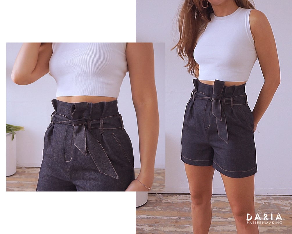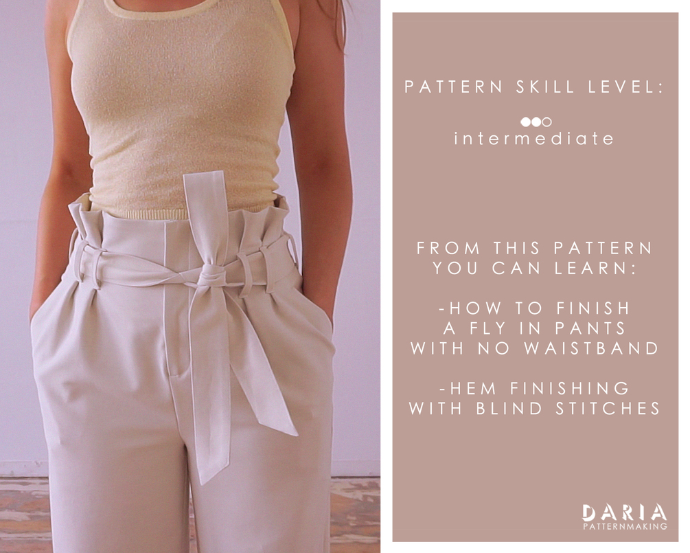 This is a digital PDF sewing pattern of high-waisted paperbag style pants.