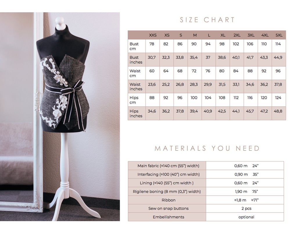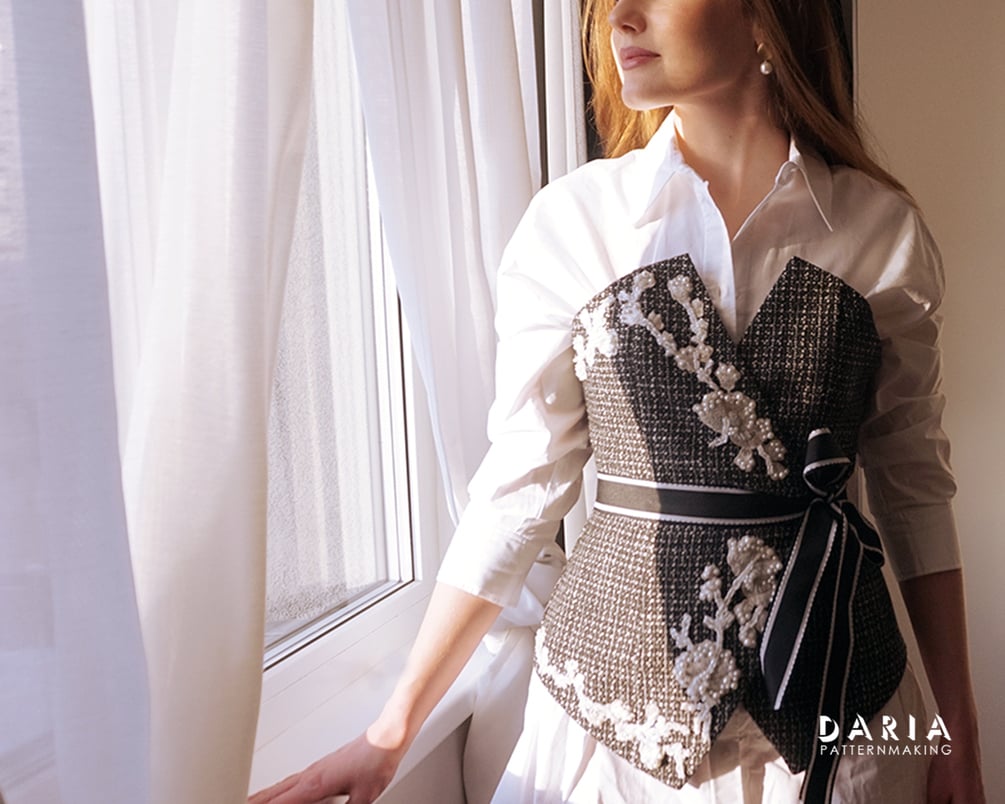 The structured shape is inspired by a wide waist belt. I recommend using tweed fabric, this timeless fabric is a fabulous choice to inject a dash of elegance into your wardrobe. Also I embelished it with beaded 3D lace, which is absolutely optional.