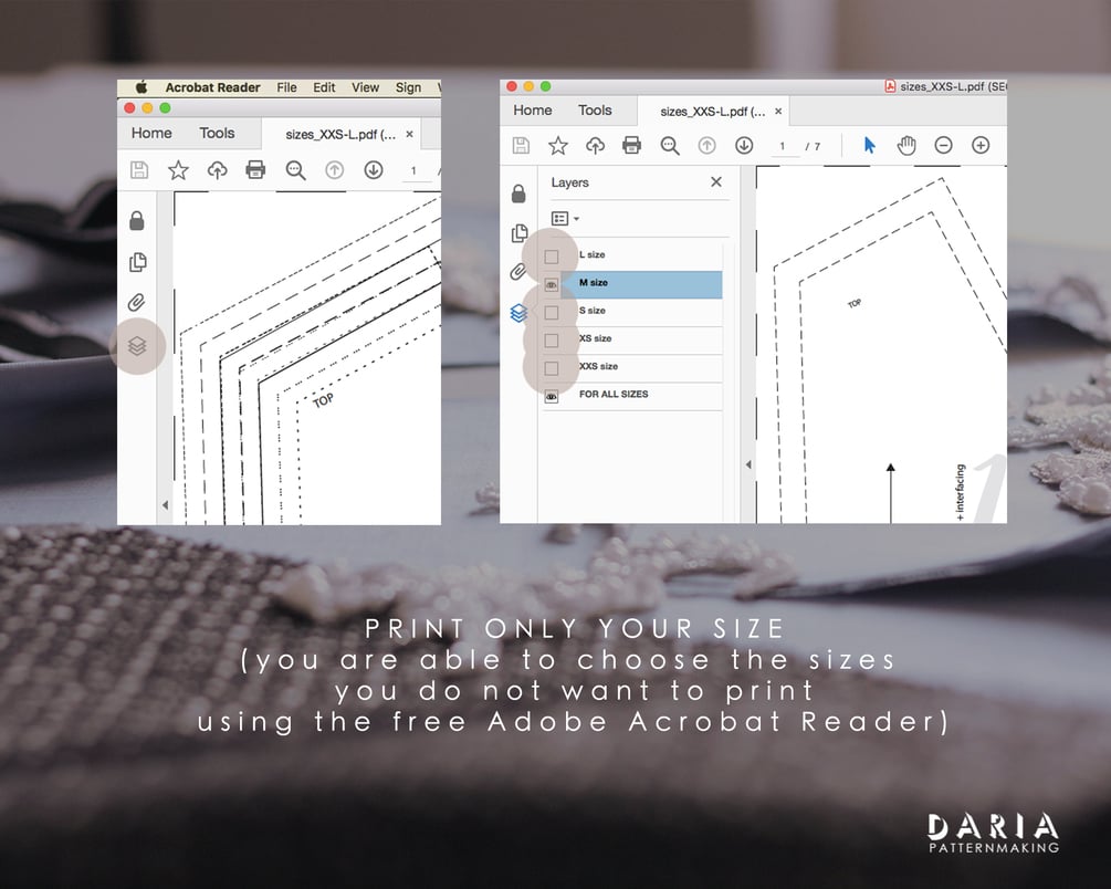 The pattern files designed with layers. There is an option to print only your size, unchecking unnecesary sizes in the Adobe Acrobat Reader. Highly recommend to download it!