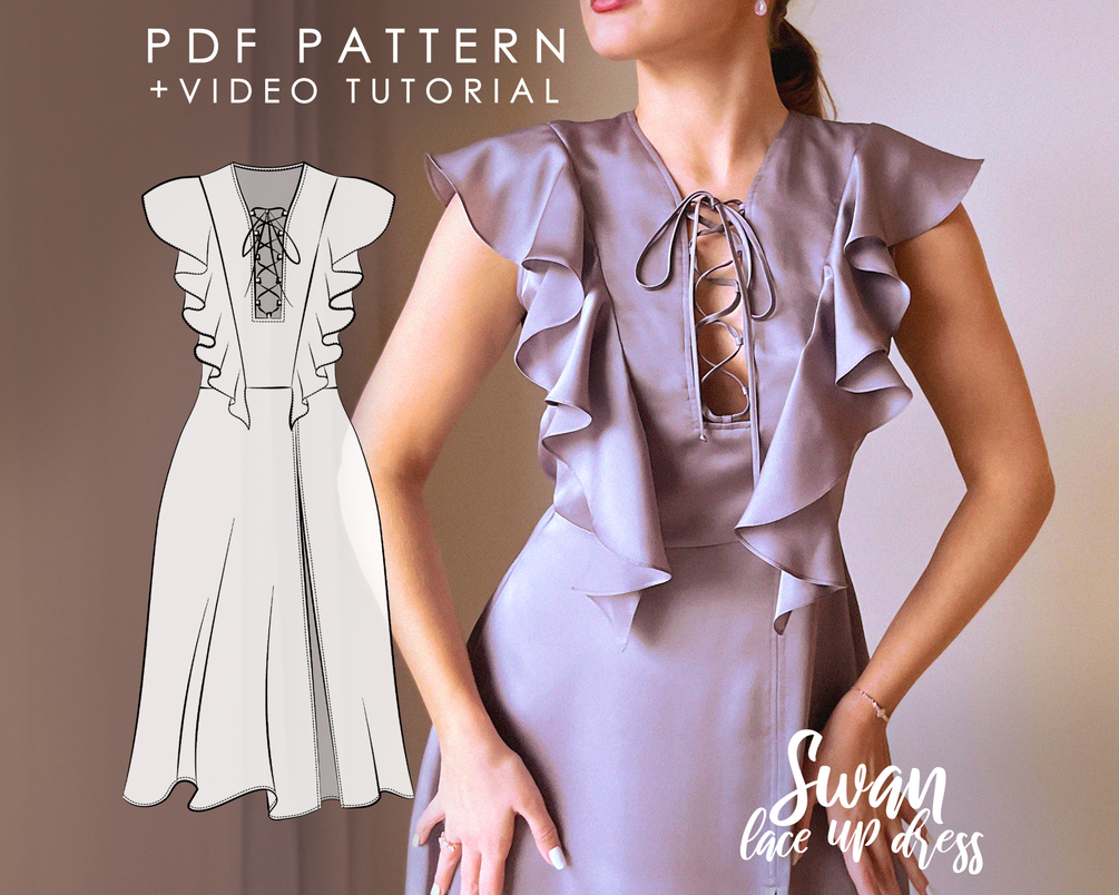 The Swan Lace-Up Dress is a semi-fitted sleeveless dress with a flared slit midi skirt. Its neckline has a lacing detail (two neckline versions: lower and higher), and there are vertical flounces on the front bodice, which continue onto the back shoulder darts. It has no closure, but it is easy to put on and maintains a gently fitted waist thanks to the elastic on the back waistline.